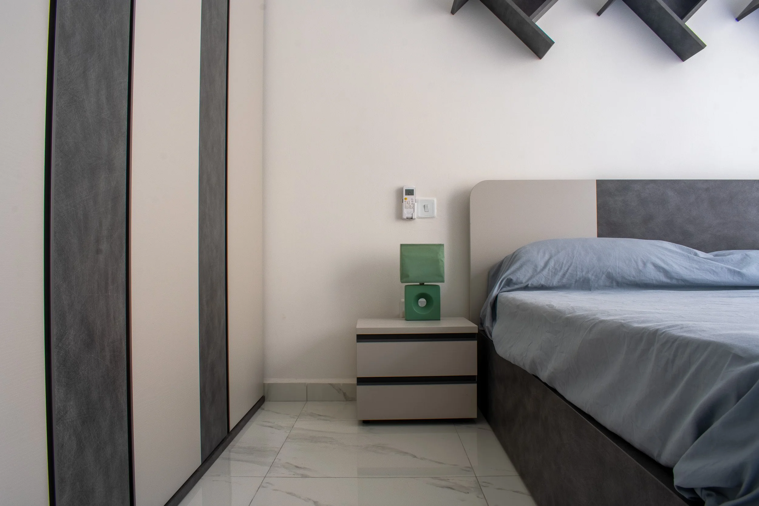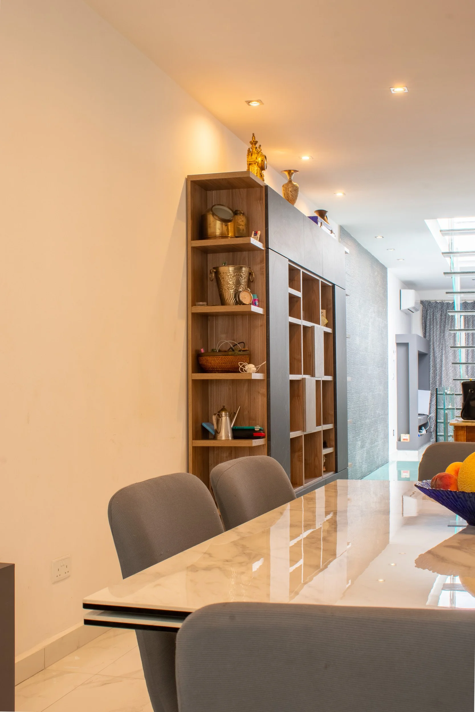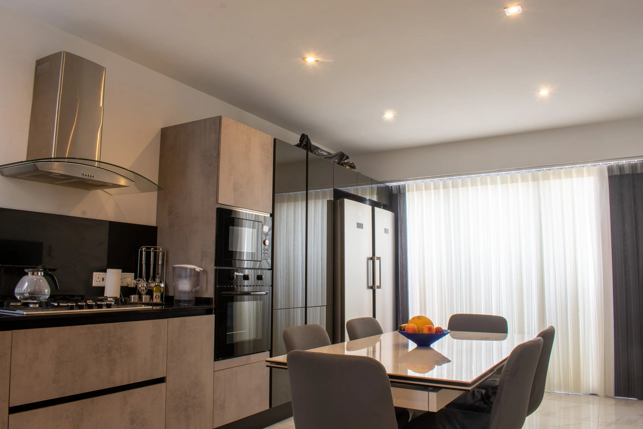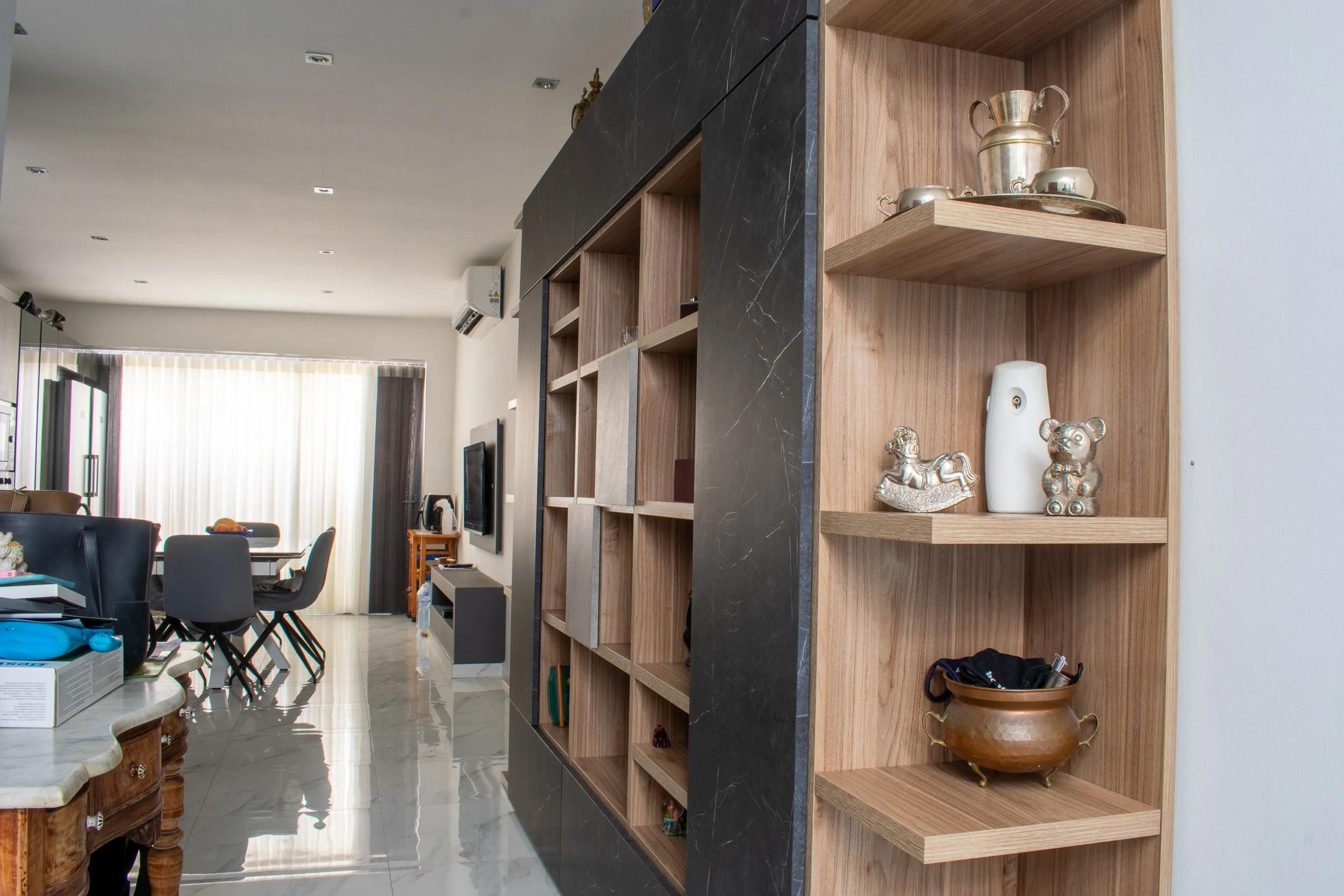 This 3-bedroom duplex penthouse project began after certain finishes, such as tiling and electrical works, were already completed. Our scope included producing 2D plans, 3D visuals, sourcing and purchasing furniture, and creating select feature walls. The overall design blends modern style with antique touches from the client’s own collection. Spaces covered included the kitchen and dining area, living room, main bedroom with walk-in, a boys’ spare bedroom, and a smaller guest bedroom. Storage solutions played a key role, with all work executed within a strict budget.