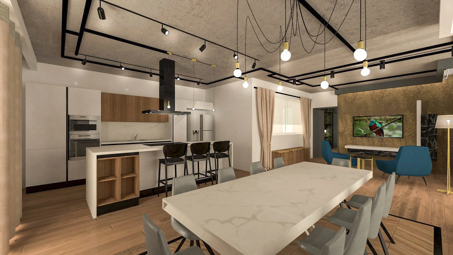 In 2020, this penthouse, was designed with an industrial aesthetic, featured a low ceiling height, requiring adherence to regulations that allowed only 30% of the space to be fitted with a false ceiling. Serving as an extension of the floor below, which already had a spacious living area, the focus here was on the dining and kitchen zones, complemented by a main bedroom with walk-in wardrobe and ensuite. We also developed a concept for the expansive outdoor space, dividing it into distinct zones: relaxation, jacuzzi, kitchen and dining, and laundry. For this project, we produced detailed 2D plans and 3D visuals to bring the design vision to life.